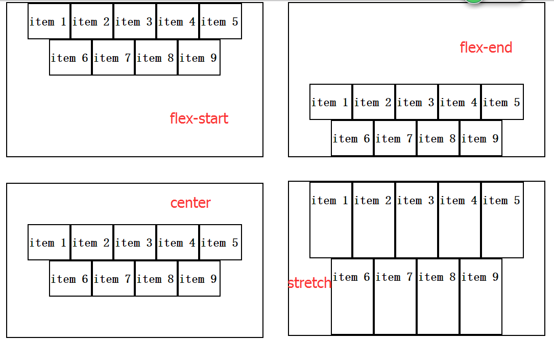 决定了item在交叉轴上的对齐方式,可能的值有flex-start|flex-end|center|baseline|stretch,当主轴水平时,其具体含义为