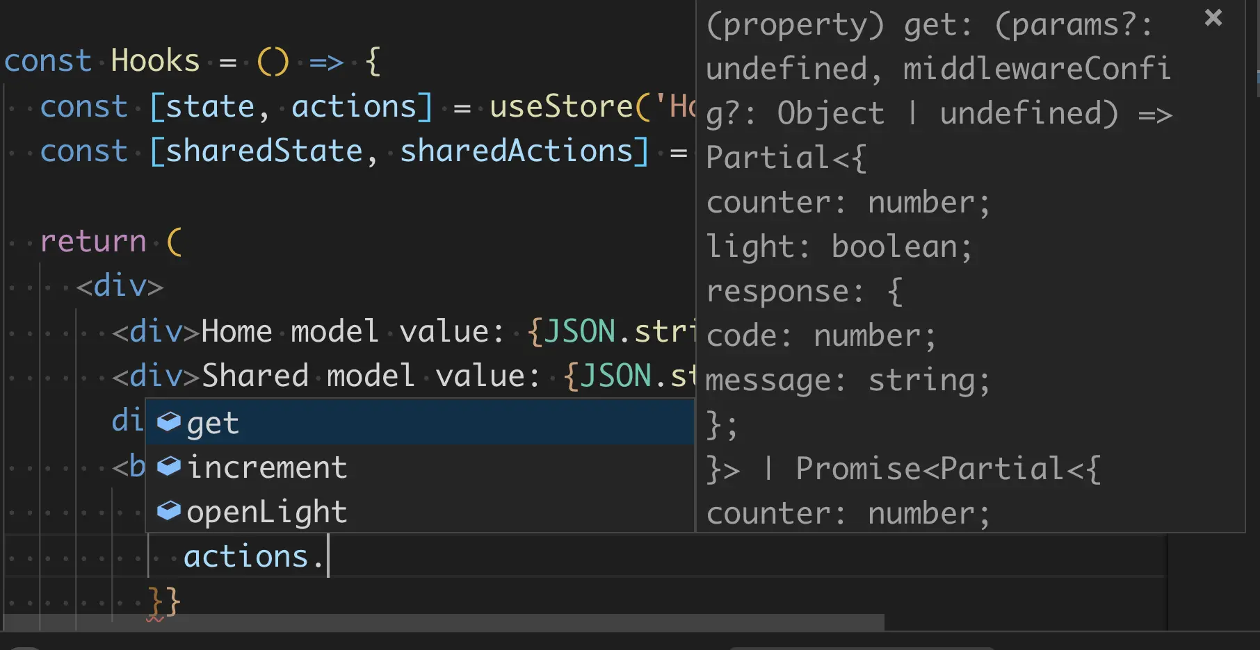 type,interface都是TypeScript开发者的需要的类型定义,写这些类型最终就是要产出ModelType<State, ActionParams>来表示model的类型,这样调用useStore返回的state和actions就都是有类型的了