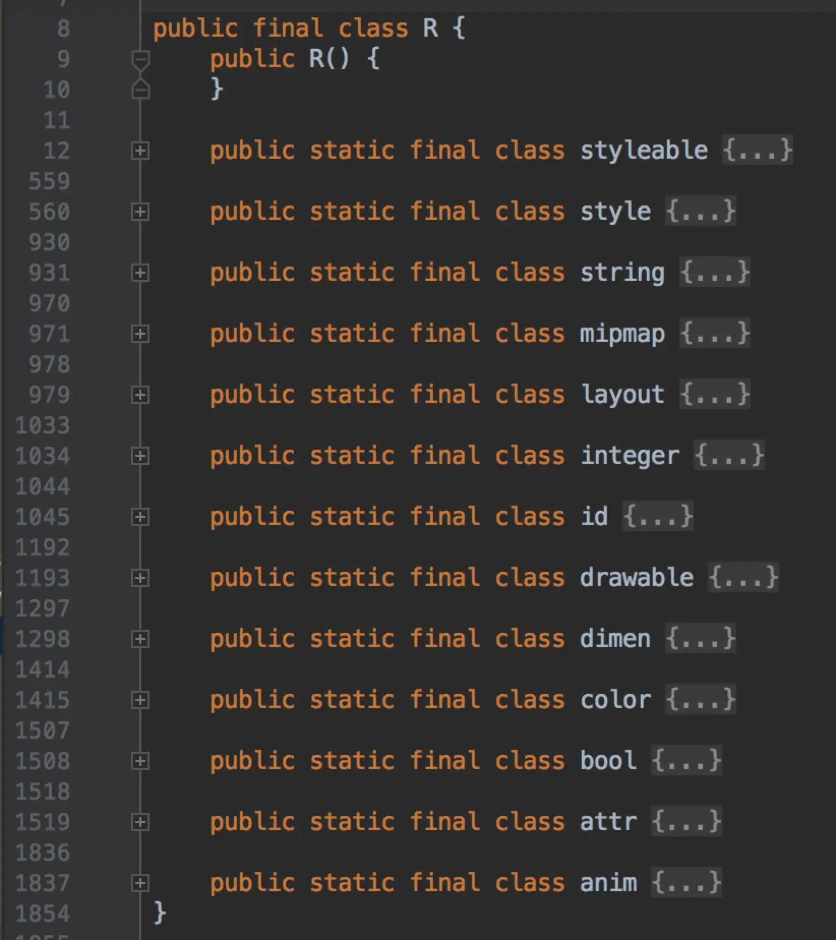 这里面,只有 styleable 最为特殊,只有它里面有 public static final int[] 类型的字段定义,其它都只有 int 类型的字段。