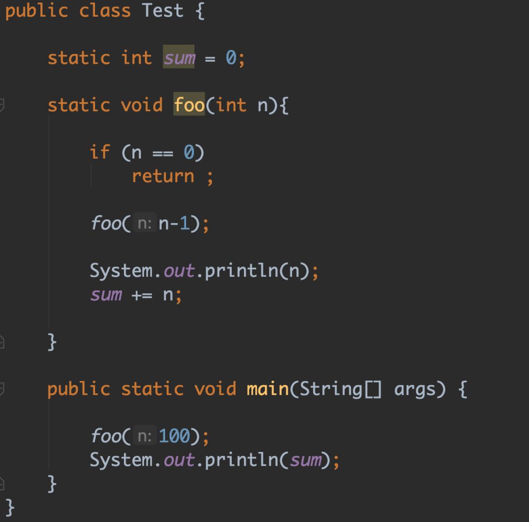 现在,可以回到解决1到100求和问题了。利用递归的思想来求解就是让100一直递减到0结束,对于每一次递减后的整数,将其累加起来。因此可以快速的写出下面的代码: