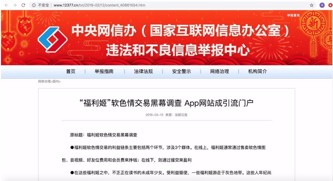 上段时间《法制日报》写了一篇《“福利姬”软色情交易黑幕调查 App网站成引流门户》的文章,讲述了福利姬软色情交易流行以及对相关黑幕的调查细节,上周中央网信办违法和不良信息举报中心官网进行了转载。