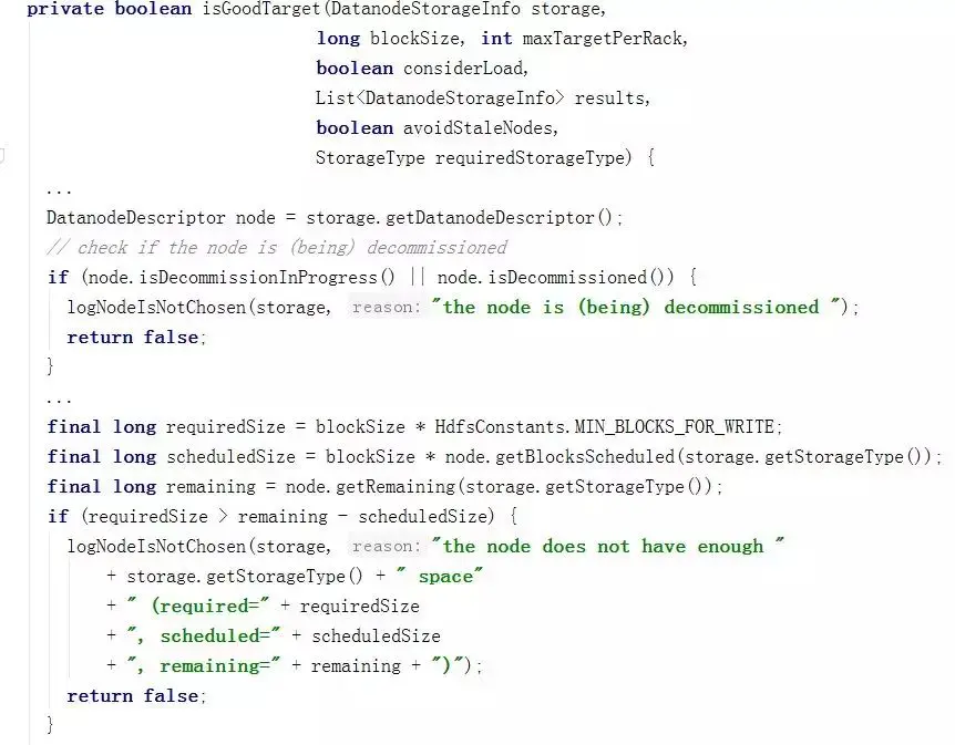 在BlockPlacementPolicyDefault.java中的isGoodTarget定义了选取Datanode节点策略,其中有两项是“节点是否在下线”、“是否有足够存储空间”,如果不可用数量过多,则可能导致选择不到健康的Datanode,因此,必须保证一定数量的健康Datanode。