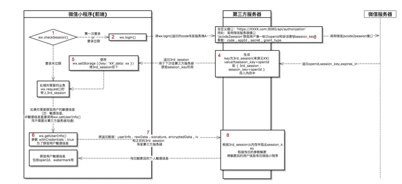 看了好多文档关于登录相关的介绍,下图的介绍是比较详细的过程,开发过程中也是采用的这个逻辑。只不过我们没有获取用户的敏感信息,所以没有7、8步骤。直接通过wx.getUserInfo()获取到用户名、头像等信息即可满足我们的需求。