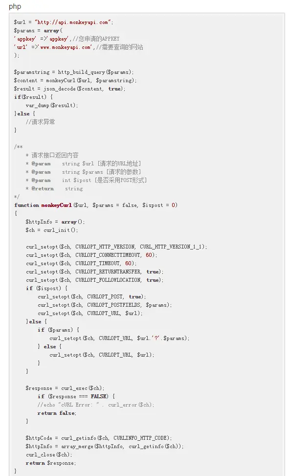 网站域名被微信屏蔽拦截怎么解决?如何防止微信封域名?点击域名在微信上提示 三种常见情况: 1、已停止访问该页面。据用户投诉及腾讯手机管家云网址检测,该网页可能包含恶意欺诈内容。 2、已停止访问该网页。网页包含诱导分享、诱导关注内容,被多人投诉,为维护绿色上网环境,已停止访问。 3、已停止访问该网页。网页包含色情内容,被多人投诉,为维护绿色上网环境,已停止访问。 遇到这种情况后,对于利用微信渠道来做产品推广已经营销的人来说可谓是一大损失。那么我们怎样来避免因为微信域名被屏蔽或者被拦截而给我们带来的损失呢??猴子数据针对域名检测专门提供了微信/QQ域名检测接口,能够实时查询与检测域名是否被微信/QQ封杀。猴子数据用的是全网最新技术,采用协议检测,协议分布在不同的服务器上,技术都是从华为,腾讯出来的,稳定性高达99.999%。猴子数据微信域名检测接口的反应速度最快可达毫秒每次。用户还可以根据不同的需求选择不同的频率套餐。 下面给大家提供一部分代码供大家参考。不懂的可以联系wx:mkapi002 QQ: 2798913756