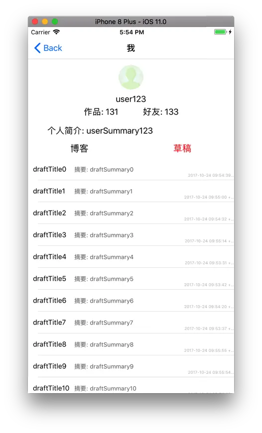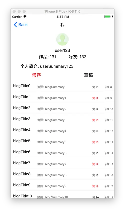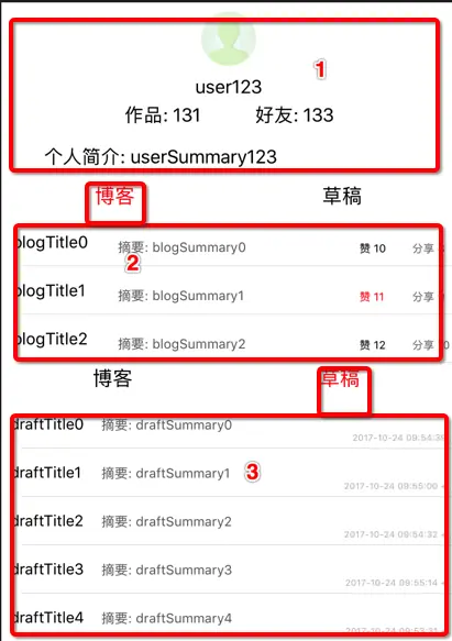 这个界面分为三个部分,顶部的个人信息展示,下面有两张列表,分别展示博客和草稿内容。 我们先来看看一般新手都是怎么实现的