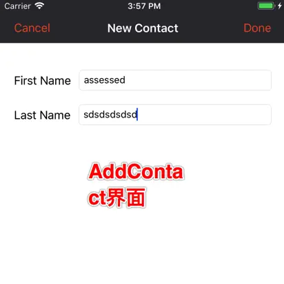 如上图所示,有两个界面contactlist和addcontact,在contactlist的右上角点击添加按钮,跳转到addcontact界面,输入firstname和secondname后点击done按钮,回到contactlist界面,新添加的用户就显示在该界面上了。