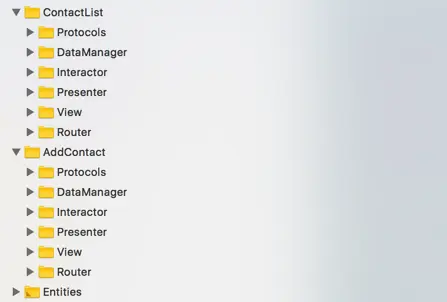可以看到每个界面都有6个文件夹,还有两个界面公用的Entities文件夹,每个文件夹对应一个分层,除了VIPER的五层之外,每个界面还有两个文件夹:Protocols和DataManager层。
