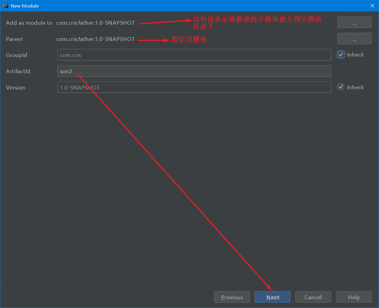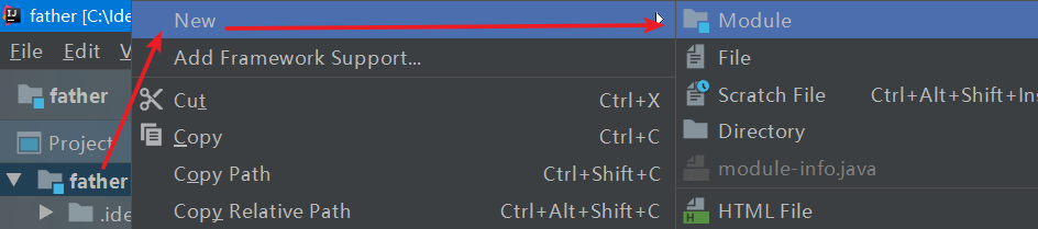 然后选中 father 模块,我们可以以 father 模块作为父模块,新建我们的子模块,每个子模块负责不同的业务