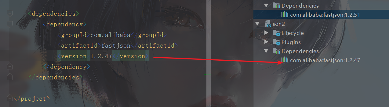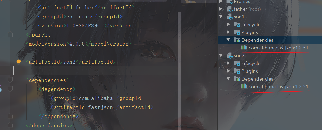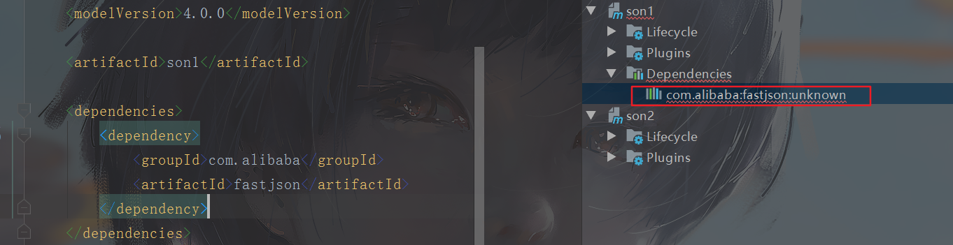 在 son2 子模块的 pom.xml 中同样引入 fastjson 的依赖