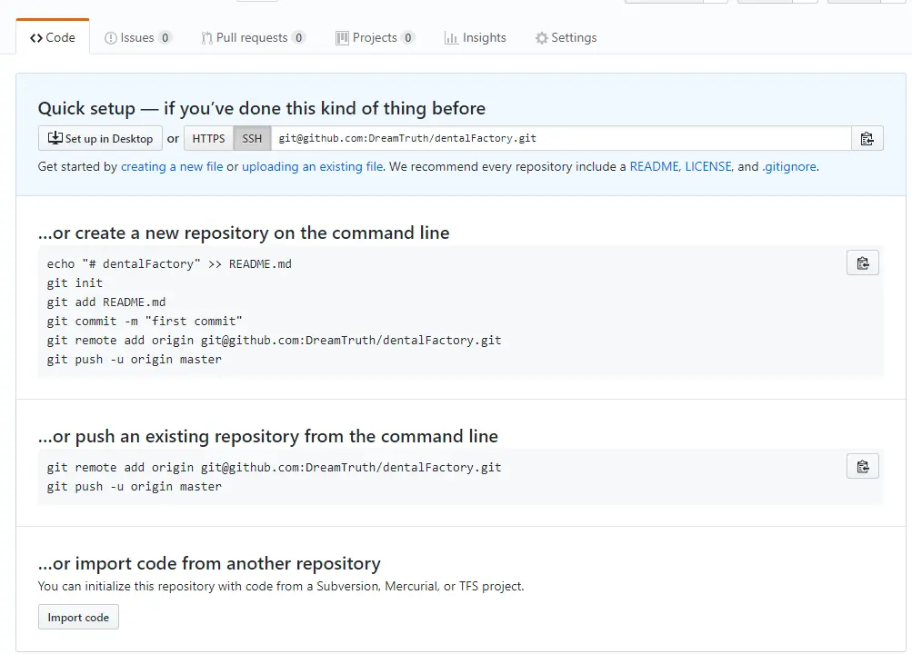目前,在GitHub上的这个dentalFactory仓库还是空的,GitHub告诉我们,可以从这个仓库克隆出新的仓库,也可以把一个已有的本地仓库与之关联,然后,把本地仓库的内容推送到GitHub仓库。