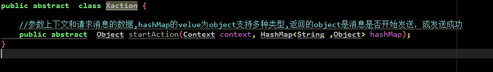 Xaction是抽象类,里面包含一个抽象方法startAciont,此抽象方法主要是让实现类对发送消息做做一个传递,也就是将发送的消息传递给对应的module,并返回结果(是否成功将消息传递)。