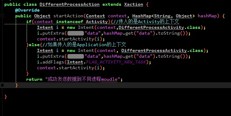 XrouterRequest mXrouterRequest =XrouterRequest.create().putData("data","发给不同进程的数据测试").putActionName(DifferentProcessActionMessage.DIFFERENTPROCESSACTIONNAME);