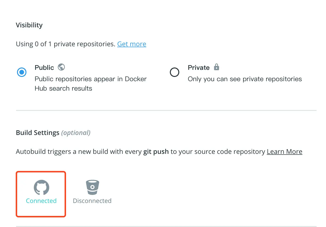 接下来在 hub.docker.com 上点击 Create Repository(没有账户的先注册账户),然后在 Build Settings 中点击 Github 图标,关联 Github 账户: