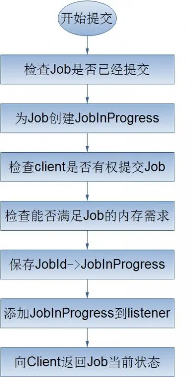 JobInProgress对象详细的记录了Job的配置信息,以及它的执行情况,确切的来说应该是Job被分解的map、reduce任务。在JobInProgress对象的创建过程中,它主要干了两件事,一是把Job的job.xml、job.jar文件从Job目录copy到JobTracker的本地文件系统(job.xml->/jobTracker/jobid.xml,job.jar->/jobTracker/jobid.jar);二是创建JobStatus和Job的mapTask、reduceTask存队列来跟踪Job的状态信息。- 检查客户端是否有权限提交Job