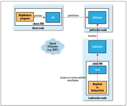 进程和状态的更新 一个作业和它的每个任务都有一个状态信息,包括作业或任务的运行状态,Map和Reduce的进度,计数器值,状态消息或描述(可以由用户代码来设置)。这些状态信息在作业期间不断改变,它们是如何与Client通信的呢?