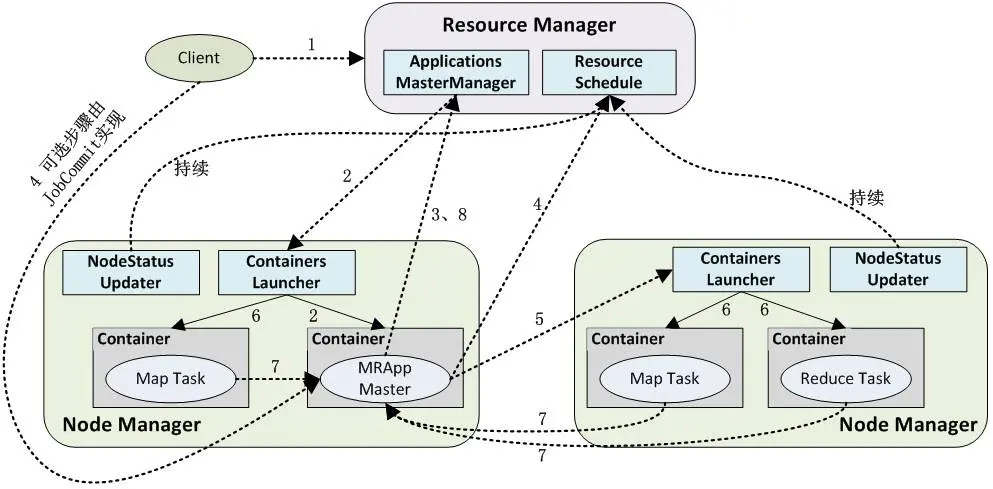 各个任务通过某个RPC协议向AM汇报自己的状态和进度,以让AM随时掌握各个任务的运行状态,从而可以在任务失败时重新启动任务;ApplicationMaster与NM的通信通过NMClientAsync object来完成,容器的所有事件通过NMClientAsync.CallbackHandler来处理。例如启动、状态更新、停止等。