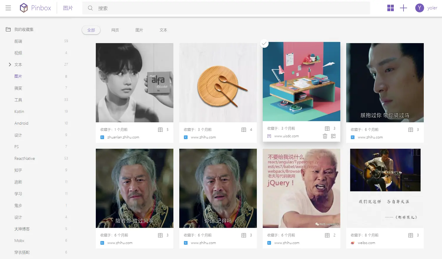 pinbox 首页 功能方面也比较全面,对于收藏内容的管理也很方便,轻松拖拽就可以实现移动分类或者删除,也可以批量操作,选中一个卡片,然后按住Shift,再点击第二个卡片,会自动选中两个卡片之前的所有收藏。