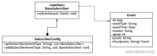 订阅者需要实现 BaseSubscriber 接口,另外在启动时,需要把事件与订阅者的关系维护在 SubscriberConfig 类中: