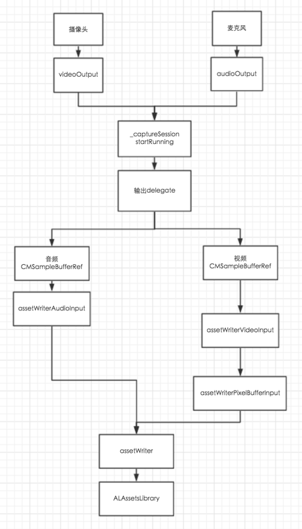 videoInput和audioInput为_captureSession的输入,同时设置videoOutput和audioOutput为_captureSession的输出,并且设置videoOutput和audioOutput的输出delegate。3、
