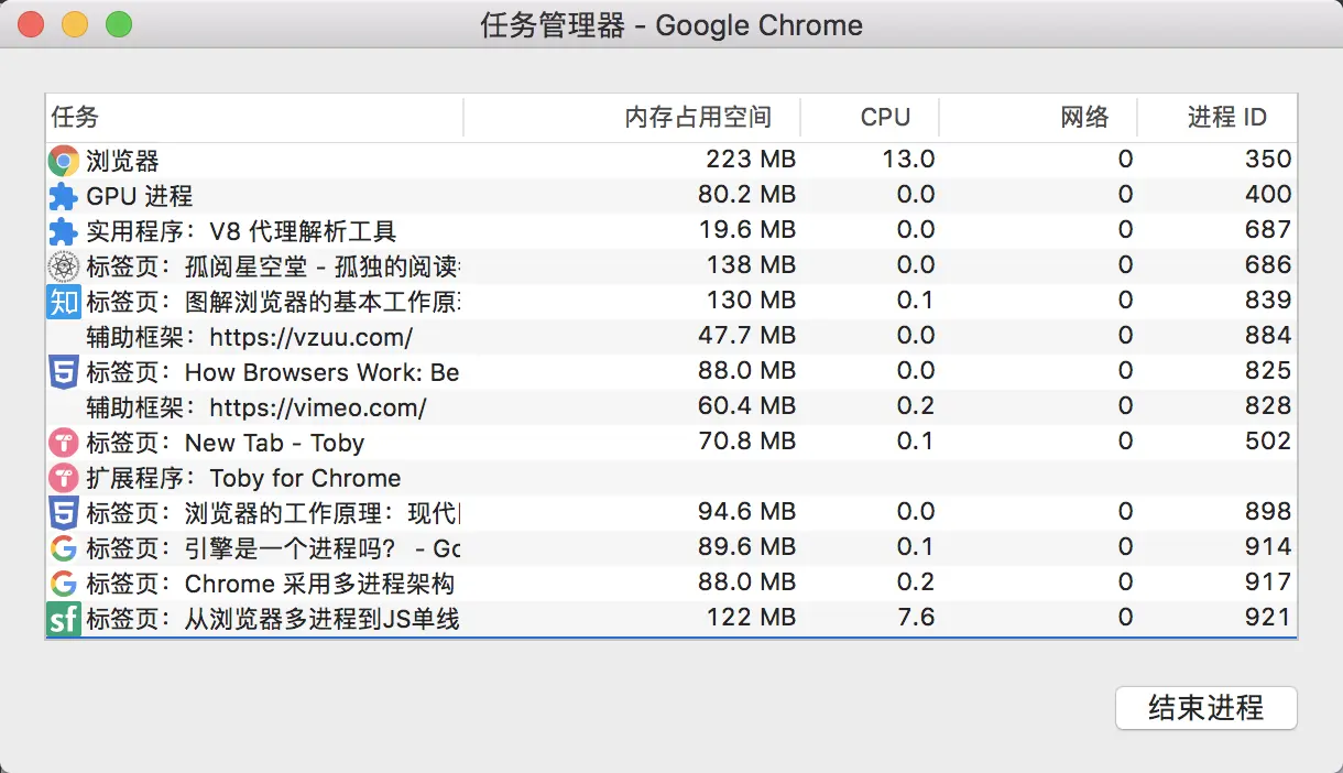 那么我们来来看看Chrome是对应的浏览器架构是怎样的呢?当我们打开任务管理器的时候,会看到看到浏览器开启会有多个进程(可以通过Chrome的更多工具 -> 任务管理器自行查看。)。