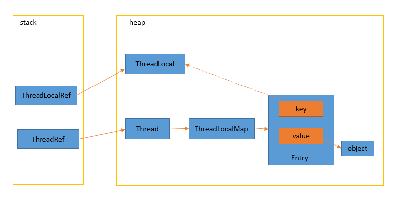 static class ThreadLocalMap { static class Entry extends WeakReference<ThreadLocal<?>> { Object value; Entry(ThreadLocal<?> k, Object v) { super(k); value = v; } }}