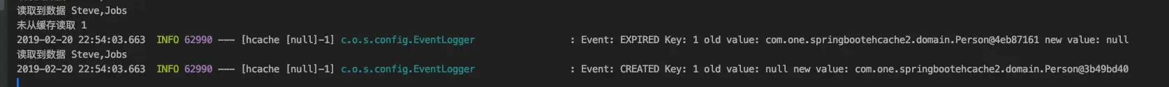 http://localhost:8080/person/get?id=1,可以从控制台看到如下结果:可以看出第二次访问时,直接使用的先前缓存的数据。由于缓存过期策略设置为 10秒,过了10秒再访问一次查看日志,可以根据事件日志器看出缓存失效后重新获取的数据,再添加到缓存中去。