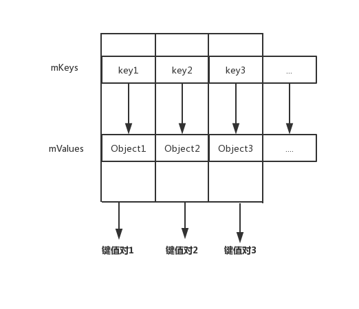 Obeject数组mValues存储所有的value key和value根据下标一一对应,也就是说想得到某个键值对,只需要根据某个下标index利用mKeys[index]中取出key值,再利用mValues[index]取出value,就得到了一个key->value键值对了。