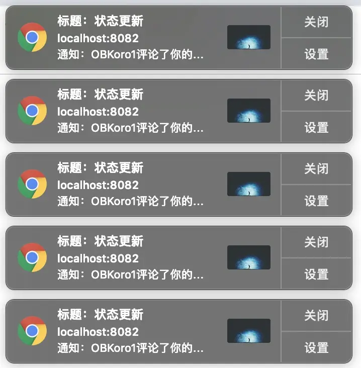 没有设置不自动关闭的话,chrome通知将会在4.5秒左右自动关闭通知,safari则是5秒钟(无法设置不自动关闭)。