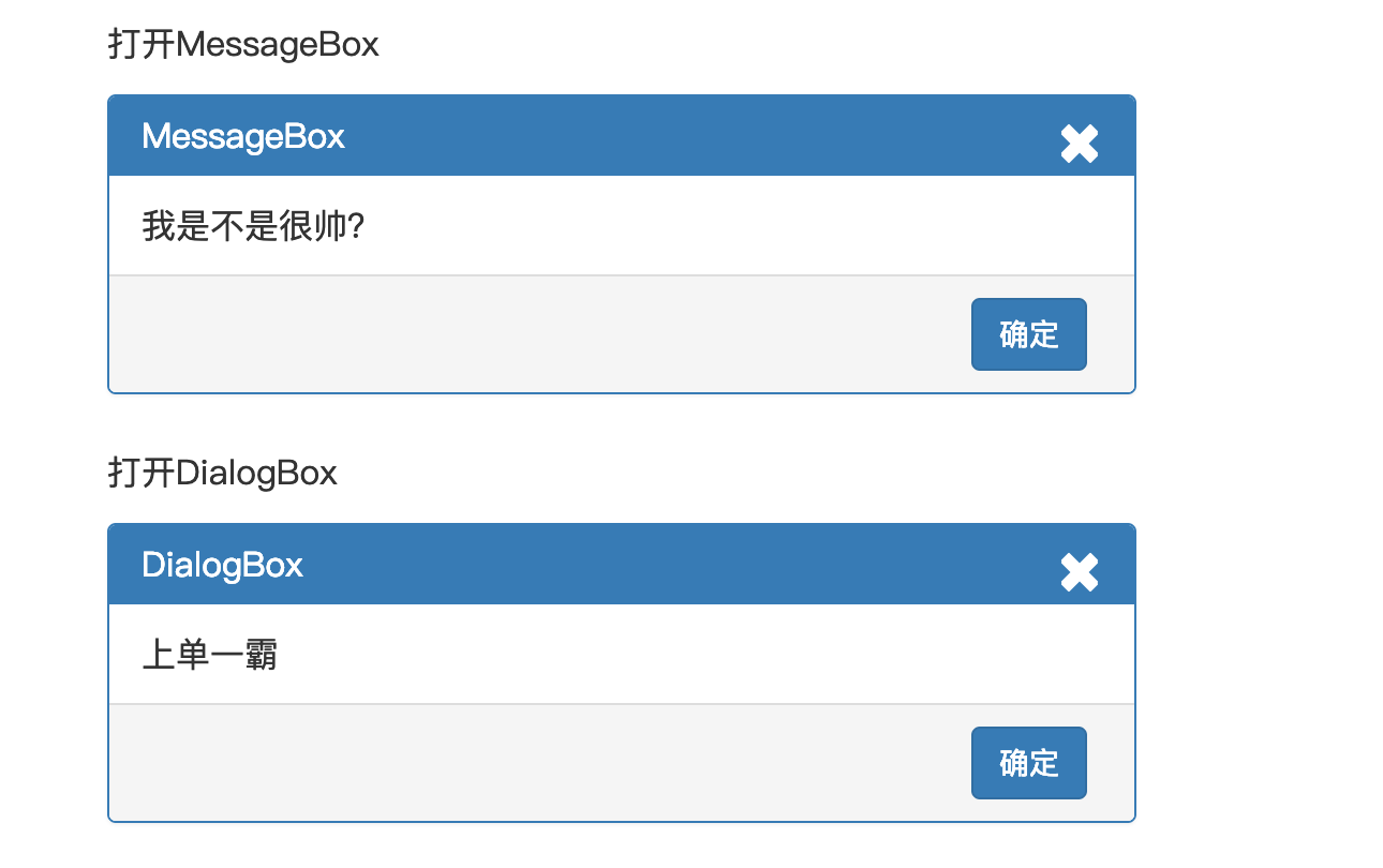 从场景上说,MessageBox 的作用是美化系统自带的 alert、confirm 和 prompt,因此适合展示较为简单的内容。如果需要弹出较为复杂的内容,请使用 Dialog。