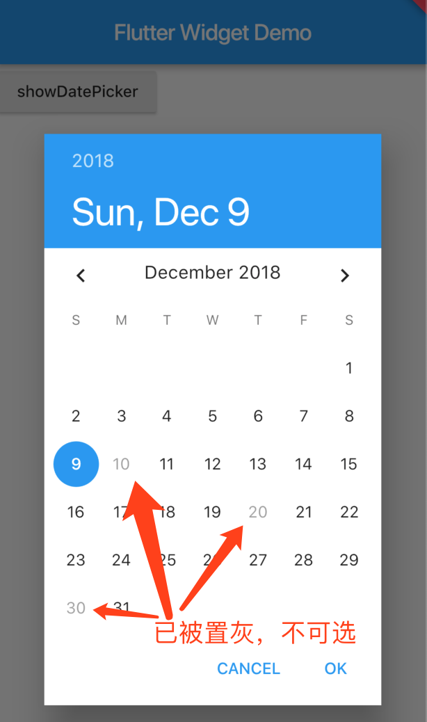 initialDate: DateTime.parse("20181209"), //初始选中日期