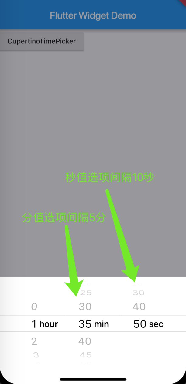 secondInterval: 10, // 秒值间隔,必须能够被initialTimerDuration.inSeconds整除,此时设置为10,则选择项为0、10、20、30、40、50六个值