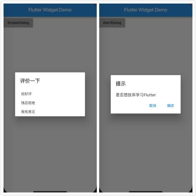 SimpleDialog和AlertDialog本身都是一个Widget,使用时需要通过showDialog方法来展示。