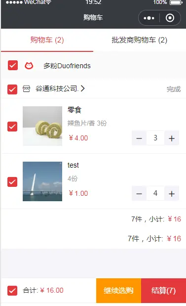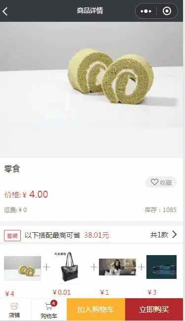 - 商品详情页,包含 加入购物车、收藏商品、立即购买、批发购买和 各活动商品购买.选择商品的规格和添加商品数量.商品的评论、长按关注公众号。