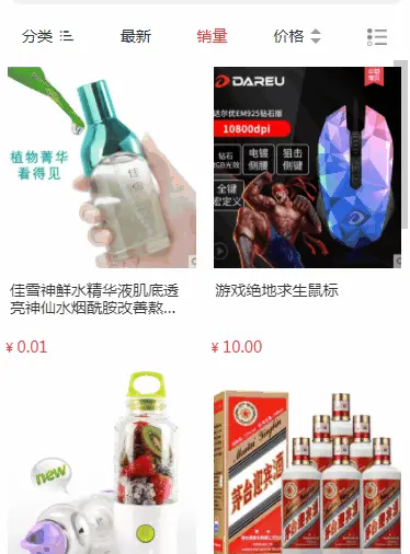 - 分类页包含 价格高低排序、时间最新排序、商品销量排序.商品列表大图 和 详情列表显示.动态获取分类菜单的高度,分类菜单大分类和详情分类. 上拉加载、下拉刷新。