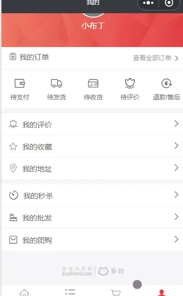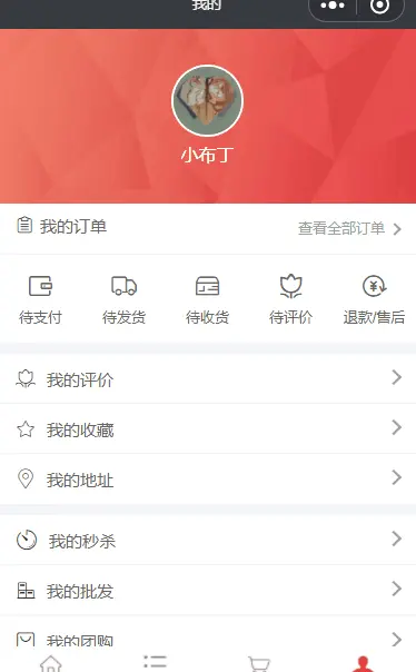 - 我的页面,包含 查询全部订单、待支付、待收货、待发货、待评价、退款/售后、我的评价、我的收藏、我的秒杀、我的批发、我的团购、