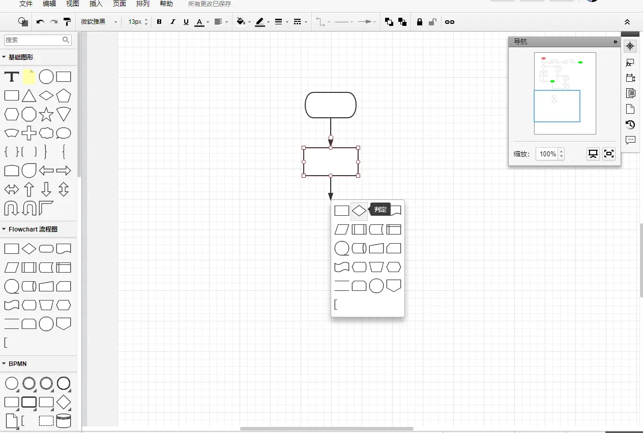 第三,processon的图形绘制比较符合用户的操作习惯,几个快捷键基本就能完整大部分需求,不用到处点来点去,画原型图的时候连接线下方直接就出现可选择的图形框,不用再去图形区拖拽,画图效率比较高。
