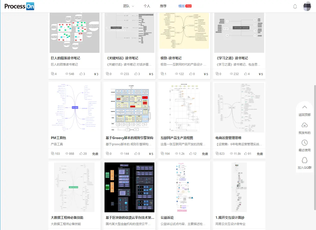 最后一点是processon它还是个社区,模板模块有很多用户上传的绘图作品,大部分都是程序员,产品经理,运营之类的互联网从业者上传的导图,流程图,对我这种小白可以学到很多知识点,还有其他一些不那么了解的岗位产出的工作内容,如果时间紧懒得画图还能直接克隆别人的模板再修改内容。