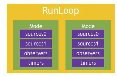 一个RunLoop包含若干个Mode,每个Mode又包含若干个Source0/Source1/Timer/Observer