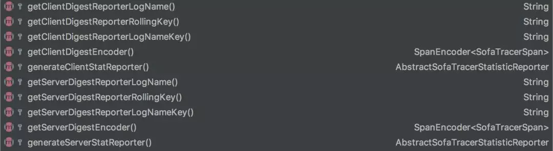 PS:上面表格中 SpanEncoder 和 AbstractSofaTracerStatisticReporter 的实现中,多了一层AbstractRpcDigestSpanJsonEncoder 和AbstractRpcStatJsonReporter的抽象,主要是由于 client 和 server 端有公共的逻辑处理,为了减少冗余代码,而采用了多继承模式处理。