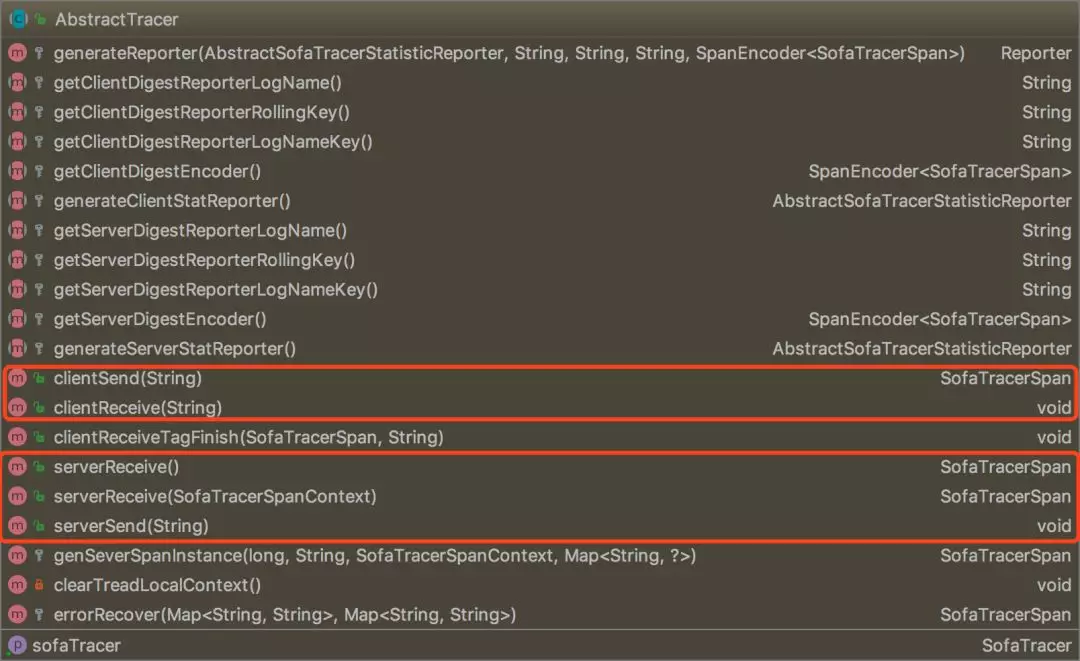 这里先来看下 AbstractTracer 这个抽象类中具体提供了哪些抽象方法,也就是对于 AbstractClientTracer 和 AbstractServerTracer 需要分别扩展哪些能力。