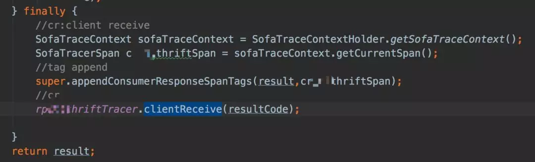在 Filter 链执行结束之后,ConsumerTracerFilter(见图一)和 ProviderTracerFilter(见图二) 分别在 finally 块中又补充了当前请求响应结果的一些信息到 Span 中去。然后分别调用 clientReceive 和 serverSend 结束当前 Span。
