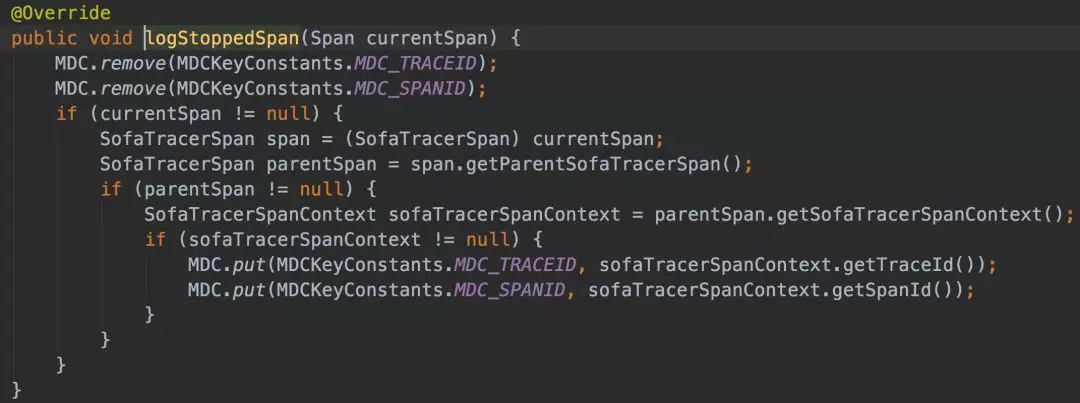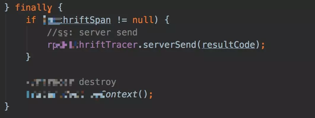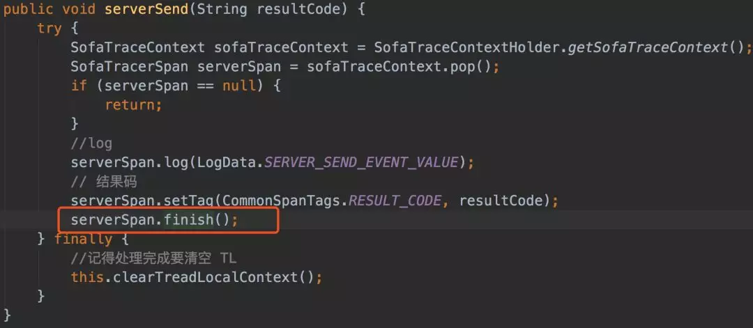 关于 clientReceive 和 serverSend 里面调用 Span.finish 这个方法( opentracing 规范中,Span.finish 的执行标志着一个 Span 的结束(见图一),当调用finish执行逻辑时同时会进行span数据的上报(见图二)和当前请求线程MDC资源的清理操作(见图三)等。