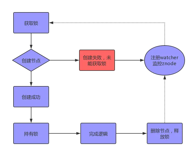 2、创建成功,则加锁成功;完成自己的业务逻辑后,删除此节点,释放锁。