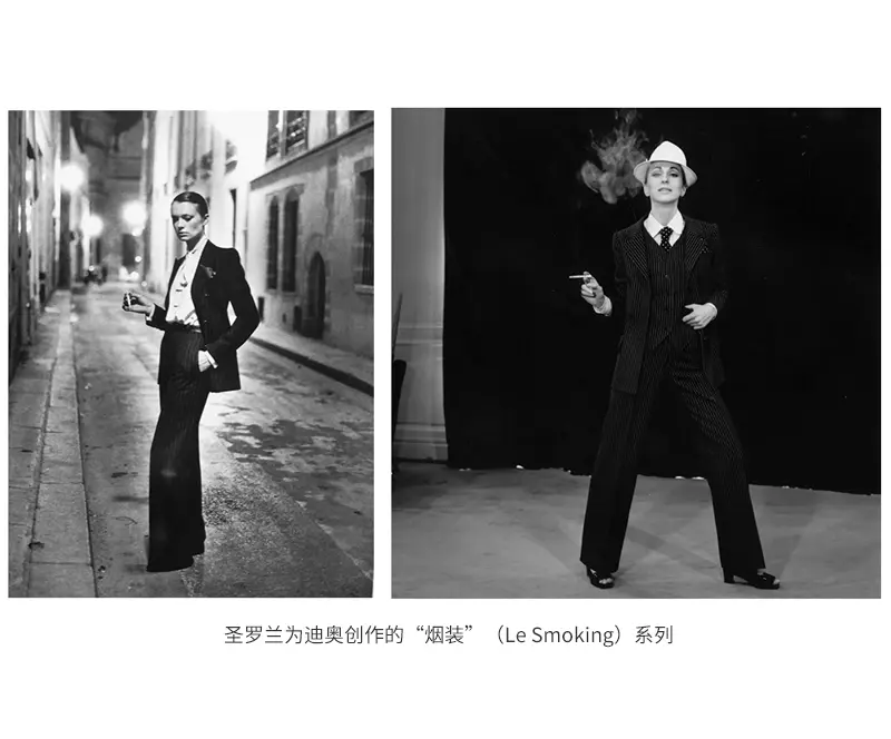 “烟装”是圣罗兰为迪奥在其接近离职期间创作的一系列女装设计,这系列设计几乎就是男士西装——白色礼服衬衫+黑色传统英式的男士Smoking Jacket西装,长长的宽脚黑西裤,视觉上就相当震撼。而且模特照几乎都烟不离手,所以被称为“烟装”,迪奥这个品牌一直给古典、优雅的时尚印象,但是自从圣罗兰接手,他却创造出了在当年看来十分前卫的设计风格,当然这个风格当时也极具争议。