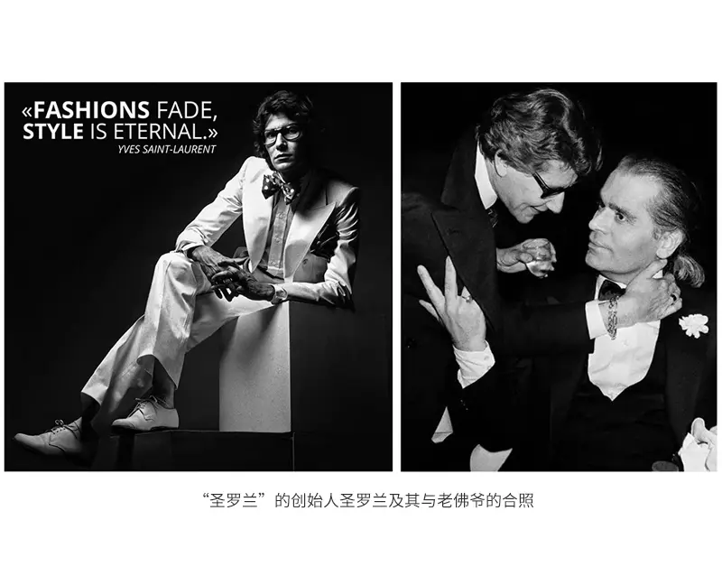 而当老佛爷才刚刚正式成为主创设计师的时候,21岁的圣罗兰已经成为了迪奥的设计首席设计师,25岁就创立了自己的品牌圣罗兰,他离开迪奥开始做老板那一年老佛爷才刚刚加盟芬迪,圣罗兰似乎一直都甩了老佛爷一截,但是老佛爷却曾公开表示过很欣赏圣罗兰,特别是其为迪奥创作的“烟装”(Le Smoking)系列,如图所示: