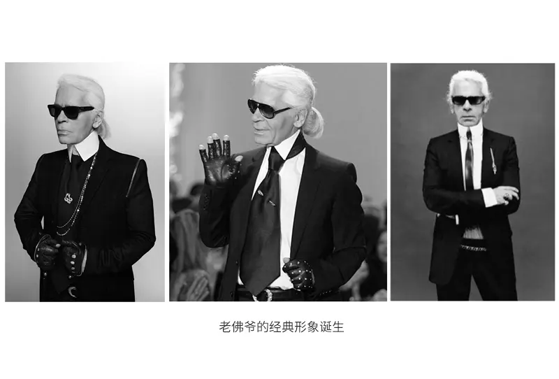 他接手香奈儿后开始大胆的重新进行诠释和发展,而他经典的银发、墨镜、白色衬衫和黑色外套形象也从这个时期正式开始出现。