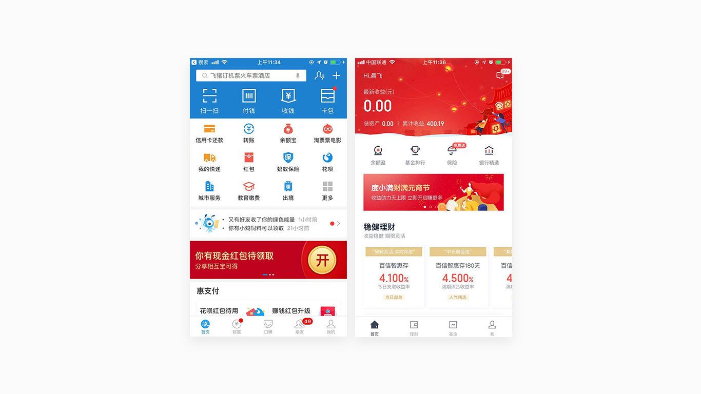 首先我们要明确设计目的是什么,无论是文字与底之间的明暗反差还是重要功能的突出设计,我们在设计稿的基础上面可以把它转换为黑白色调,转换完了以后我们看下是否灰度最高的地方是我们重点要突出的内容并且能够保证用户聚焦于此。大面积颜色很容易让用户聚焦关键问题。比如下面的支付宝和度小满理财我们可以清楚的看到支付宝当前页面比较重要的部分是扫一扫这行的操作,度小满理财也一样的在顶部最新收益做了红色重点突出。我们要在理解产品目的的基础上运用颜色反差区分界面上面产品要表达的优先级。