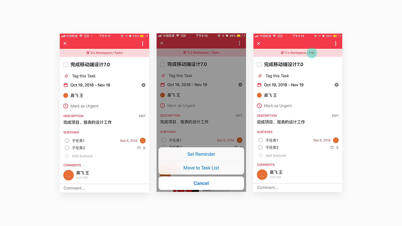 下面是Redbooth移动端,我们拿其中的一个任务举例,当前的任务是在「Tasks」分组下的,当我们通过移动的操作把当前的任务移动到「开始」分组以后,由于当前操作没有给用户很明显的移动成功反馈,导致用户多次操作移动,并且在选择移动到分组的选项中也没有展示当前选中是哪个分组。多次狂点以后,你发现当你做了移动操作以后页面顶部的路径「Tasks」变为「开始」,这是仅有的反馈。并且顶部红色路径一直是常驻的,页面中大面积的红色对用户视觉上有很大的刺激,当前移动操作以后仅仅是文字了路径变化,完全不能吸引用户的视觉焦点,索性还不如直接页面中间弹一个toast来的实际些。