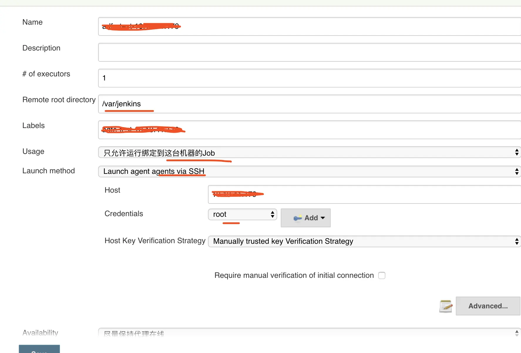 远程项目目录:节点机器会在当前填写目录下加上/workspace,按照上面的配置,机器上对应的项目目录为:/var/jenkins/workspace
