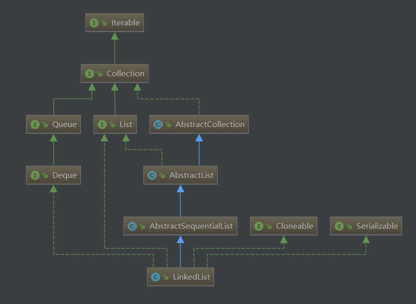 可以看到 LinkedList 继承或实现了以下类或接口: